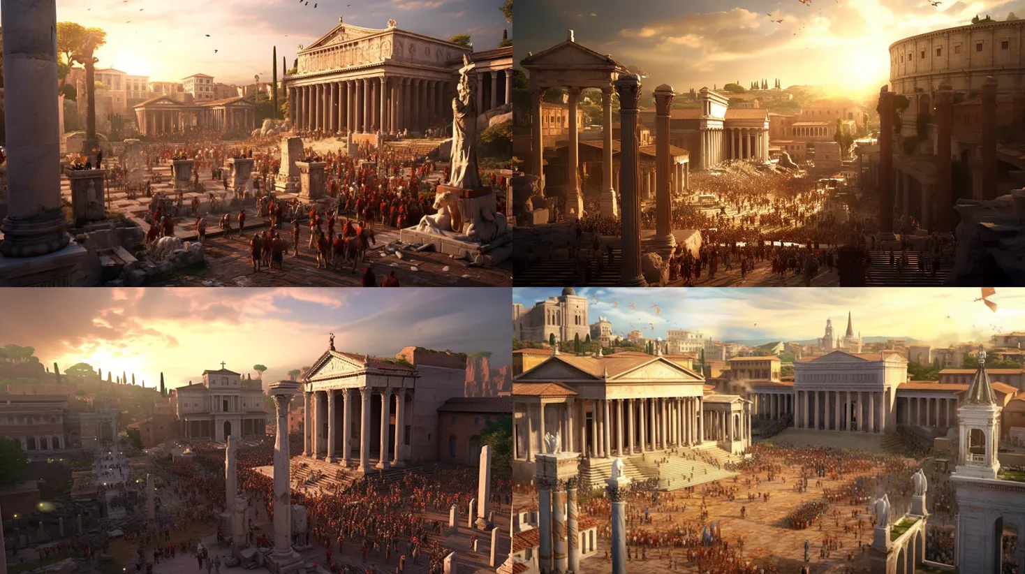 Capture a bustling scene from the Roman Forum at its peak. The architecture should be grand and ornate, with marble columns and statues. The crowd should be diverse, with senators, soldiers, merchants, and slaves. The lighting should be warm and golden, reminiscent of a Mediterranean afternoon. The colors should be vibrant, with the white of the marble contrasting with the rich reds and blues of the Roman togas. Use a wide-angle lens to capture the scale of the scene. --ar 16:9 --v 5.1 --style raw --q 2 --s 750Recreate the signing of the Declaration of Independence. The room should be filled with men in colonial attire, their faces serious and determined. The lighting should be soft and diffused, coming from the candles on the table. The colors should be muted and earthy, with a focus on the parchment of the Declaration. Use a medium telephoto lens to capture the details of the scene. --ar 16:9 --v 5.1 --style raw --q 2 --s 750Depict a medieval market in full swing. The stalls should be filled with goods like fruits, vegetables, and fabrics. The people should be dressed in period clothing, haggling over prices. The lighting should be bright and clear, typical of a sunny day. The colors should be vibrant and varied, reflecting the diversity of the market goods. Use a wide-angle lens to capture the hustle and bustle of the market. --ar 16:9 --v 5.1 --style raw --q 2 --s 750Capture a scene from the French Revolution, specifically the storming of the Bastille. The crowd should be angry and determined, with the fortress looming in the background. The lighting should be dramatic, with dark clouds overhead. The colors should be stark, with the red of the revolutionary flags standing out. Use a telephoto lens to capture the intensity of the scene. --ar 16:9 --v 5.1 --style raw --q 2 --s 750Recreate a scene from the construction of the Great Wall of China. Workers should be hauling stones, with the wall stretching out into the distance. The lighting should be harsh and bright, typical of a sunny day. The colors should be earthy, with the brown of the stones and the green of the surrounding landscape. Use a wide-angle lens to capture the scale of the wall. --ar 16:9 --v 5.1 --style raw --q 2 --s 750Depict a Viking raid on a coastal village. The Vikings should be fierce and intimidating, with the villagers running in fear. The lighting should be dramatic, with the glow of the fires illuminating the scene. The colors should be intense, with the orange of the fire contrasting with the dark blues and blacks of the night. Use a telephoto lens to capture the chaos of the raid. --ar 16:9 --v 5.1 --style raw --q 2 --s 750Capture a scene from the American Civil War, specifically the Battle of Gettysburg. The soldiers should be in the heat of battle, with smoke and dust filling the air. The lighting should be diffused and hazy, due to the smoke. The colors should be muted and grim, reflecting the seriousness of the battle. Use a telephoto lens to capture the intensity of the scene. --ar 16:9 --v 5.1 --style raw --q 2 --s 750Recreate a scene from the Renaissance, specifically an artist's workshop. The artist should be focused on their work, with various paintings and sculptures around them. The lighting should be soft and diffused, coming from a nearby window. The colors should be rich and vibrant, reflecting the art of the period. Use a medium telephoto lens to capture the details of the workshop. --ar 16:9 --v 5.1 --style raw --q 2 --s 750Depict a scene from the Industrial Revolution, specifically a factory floor. Workers should be busy at their machines, with steam and smoke filling the air. The lighting should be harsh and stark, coming from the factory lights. The colors should be grimy and dirty, reflecting the conditions of the factory. Use a wide-angle lens to capture the scale of the factory. --ar 16:9 --v 5.1 --style raw --q 2 --s 750Capture a scene from the Wild West, specifically a saloon. The patrons should be engaged in various activities, like playing poker or drinking. The lighting should be warm and inviting, coming from the saloon's lamps. The colors should be earthy and rustic, reflecting the setting of the West. Use a medium telephoto lens to capture the details of the saloon. --ar 16:9 --v 5.1 --style raw --q 2 --s 750Recreate a scene from ancient Egypt, specifically the construction of the pyramids. Workers should be hauling blocks of stone, with the pyramid rising in the background. The lighting should be harsh and bright, typical of a desert day. The colors should be sandy and earthy, reflecting the desert landscape. Use a wide-angle lens to capture the scale of the pyramid. --ar 16:9 --v 5.1 --style raw --q 2 --s 750Depict a scene from the Age of Exploration, specifically the landing of Columbus. The sailors should be disembarking from their ships, with the New World in front of them. The lighting should be bright and clear, typical of a sunny day. The colors should be vibrant and varied, reflecting the tropical setting. Use a wide-angle lens to capture the scale of the scene. --ar 16:9 --v 5.1 --style raw --q 2 --s 750Capture a scene from the Middle Ages, specifically a jousting tournament. The knights should be in their armor, with their lances at the ready. The lighting should be bright and clear, typical of a sunny day. The colors should be vibrant, with the heraldry of the knights standing out. Use a telephoto lens to capture the action of the joust. --ar 16:9 --v 5.1 --style raw --q 2 --s 750Recreate a scene from the French Revolution, specifically the Reign of Terror. The guillotine should be in the center, with the crowd watching in anticipation. The lighting should be grim and foreboding, with dark clouds overhead. The colors should be stark and intense, with the red of the revolutionary flags standing out. Use a telephoto lens to capture the intensity of the scene. --ar 16:9 --v 5.1 --style raw --q 2 --s 750Depict a scene from the American Revolution, specifically the Bosto